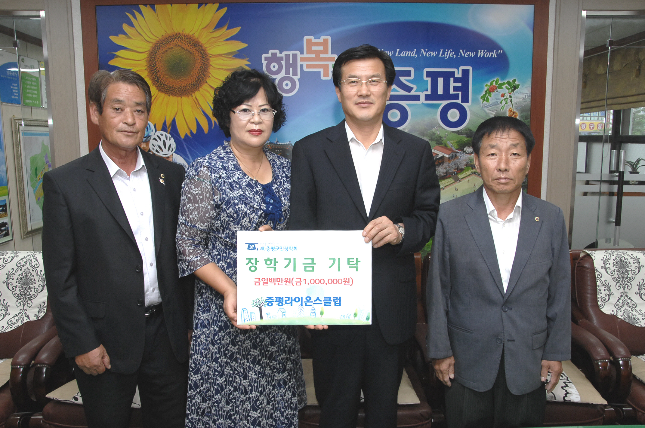 증평라이온스 클럽(회장 전명림. 사진 왼쪽에서 두번째)은 증평지역 인재양성을 위한 기금으로 써달라며 장학금 1백만원을 증평군에 전달했다.[보도자료실 참조