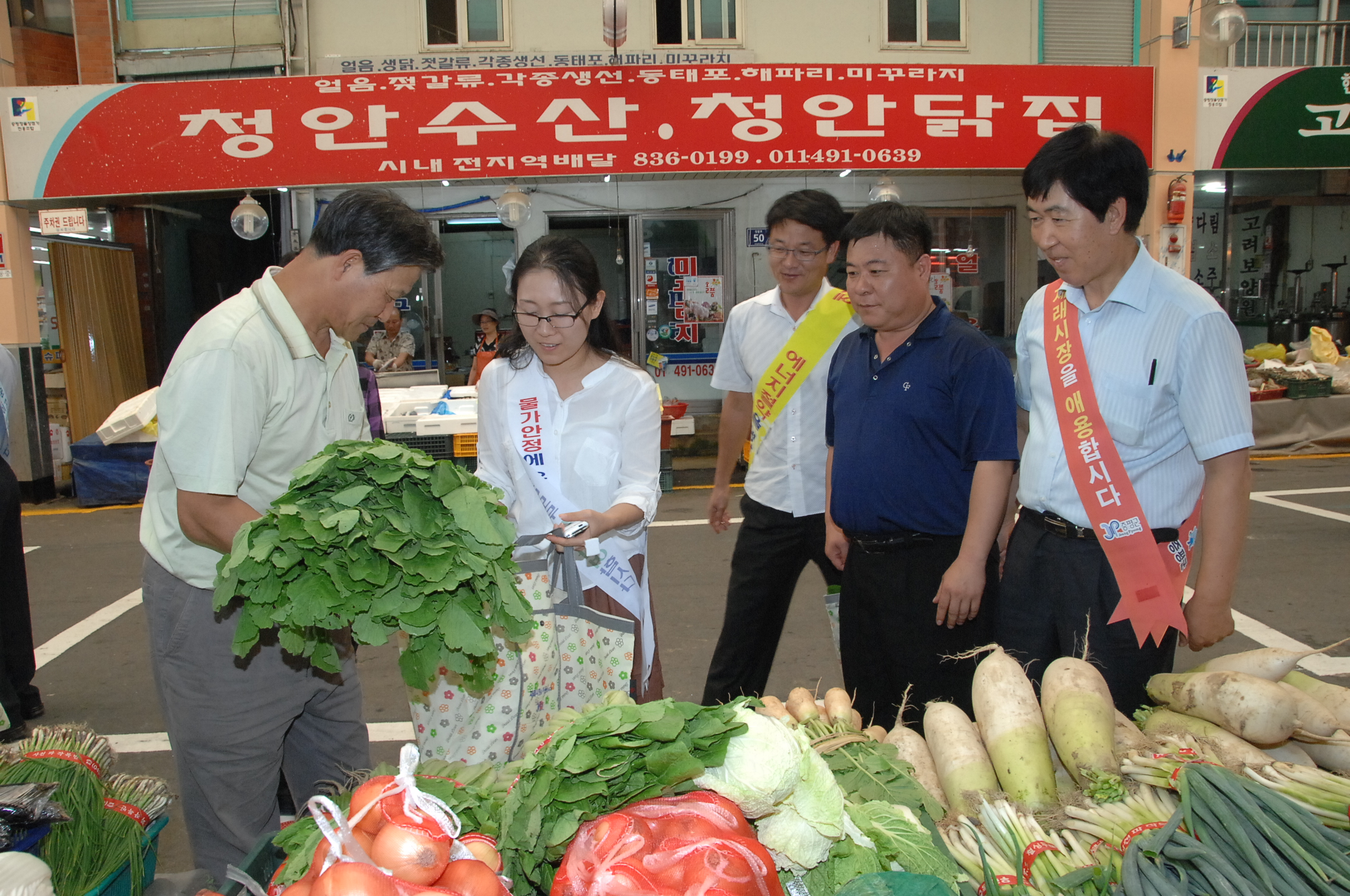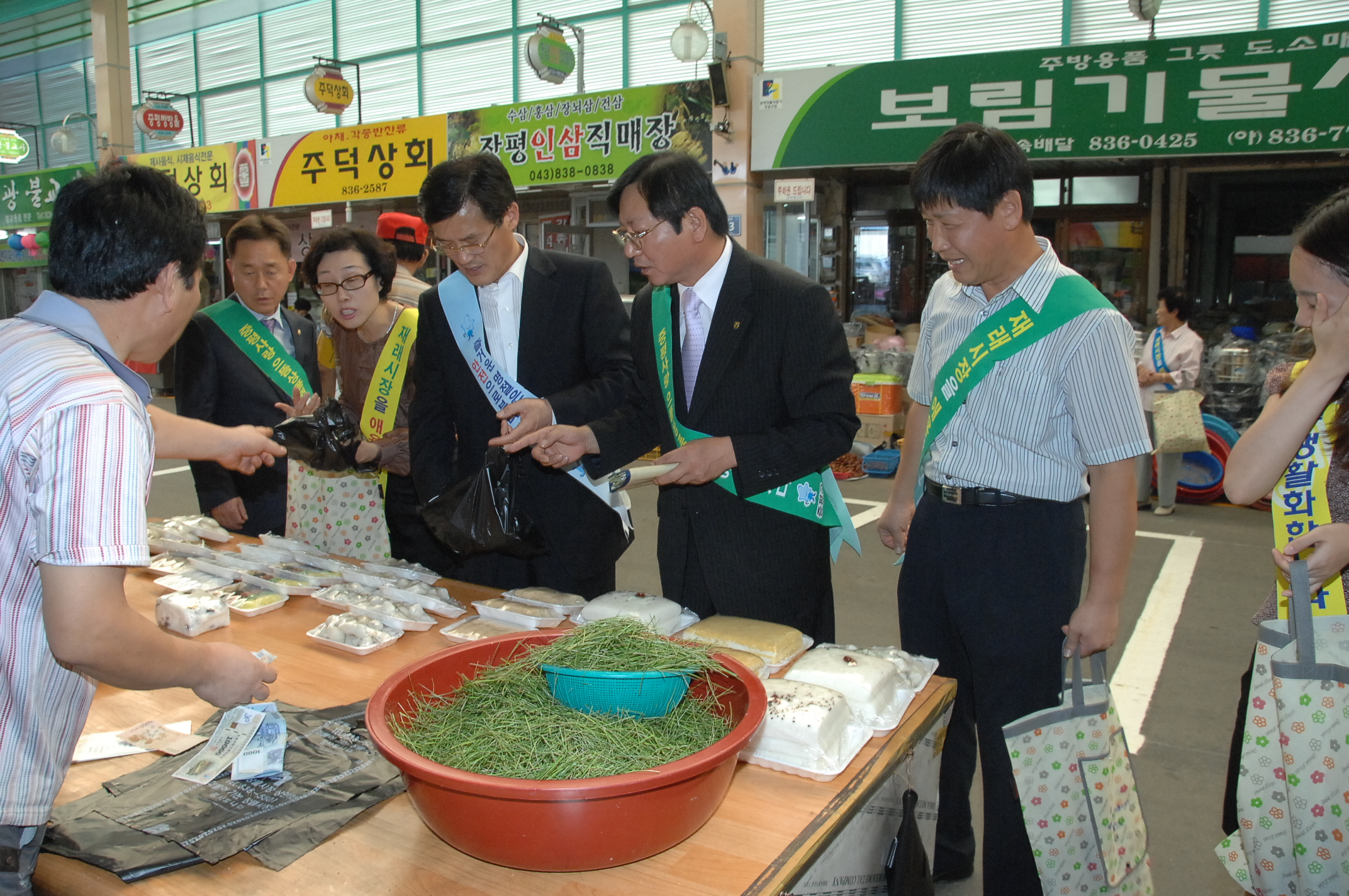 증평군 추석맞이 장보기 행사가 17일 오후 4시 홍성열군수, 김재룡군의장, 이종철농협증평군지부장, 김남순증평여성단체협의회장을 비롯한 기관단체장과 공무원, 기관단체 임직원, 여협회원, 지역 주민 등 150여명이 참여한 가운데 증평장뜰재래시장에서 열렸다