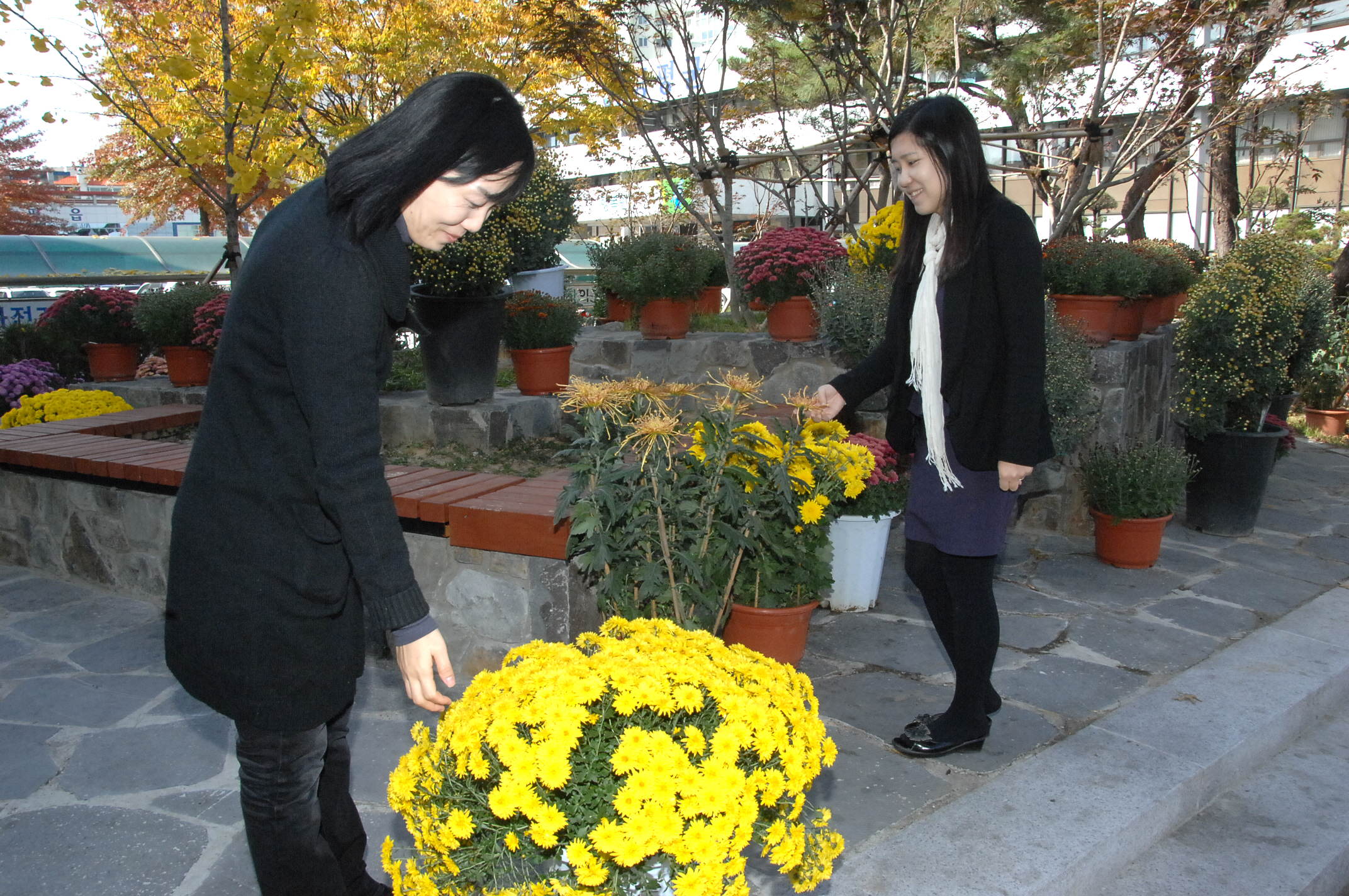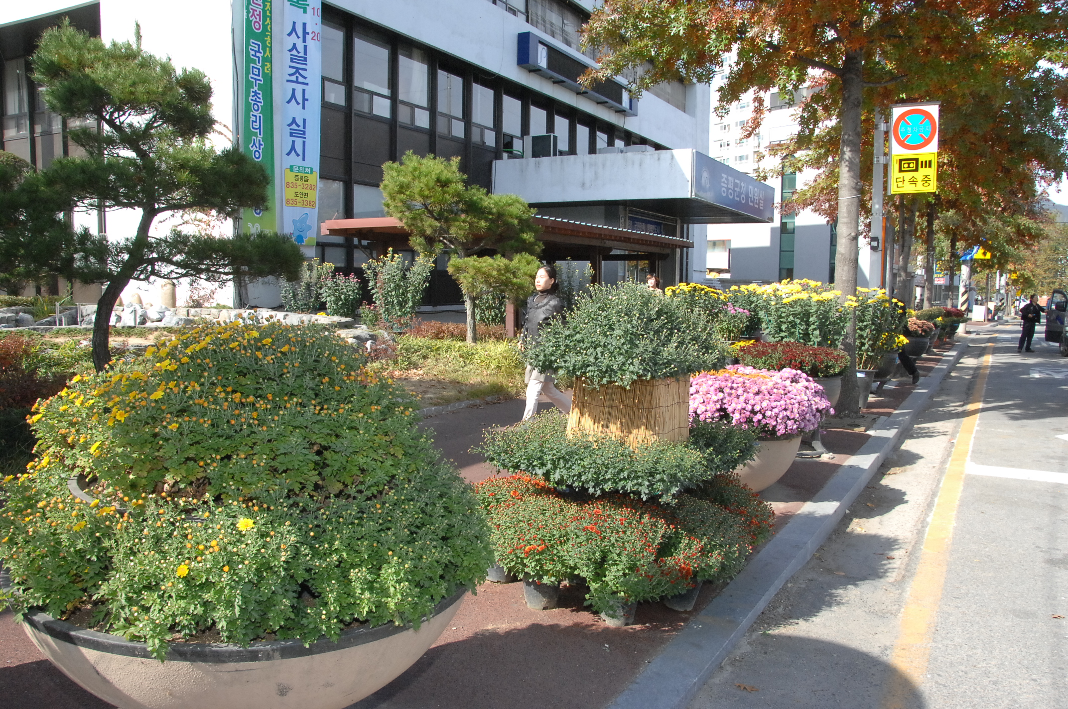증평군이 군청 민원실 앞을 비롯해 군 청사 곳곳에 가을 국화를 전시해 행인들의 눈길을 사로잡고 있다.[보도자료실 참조]