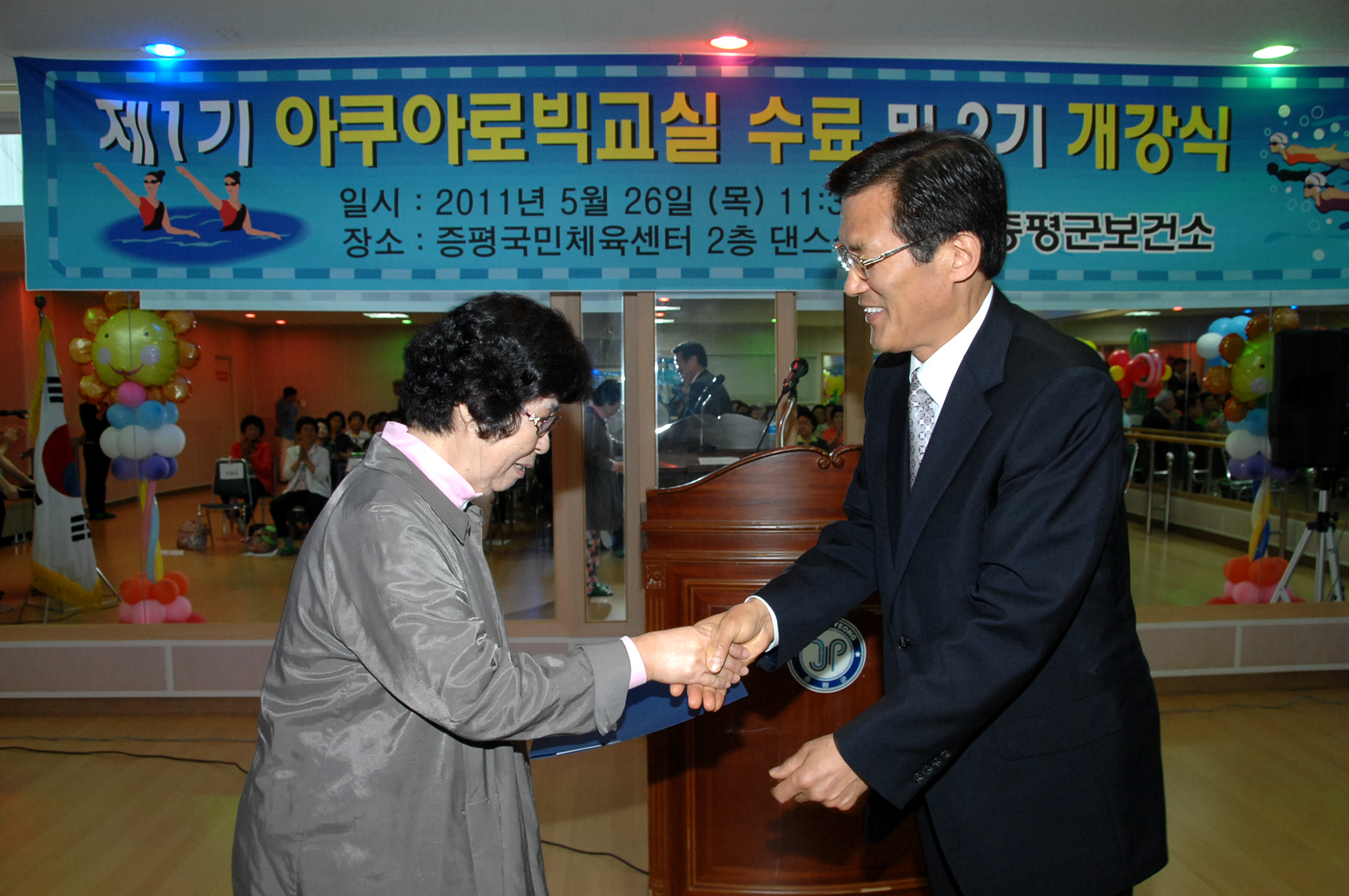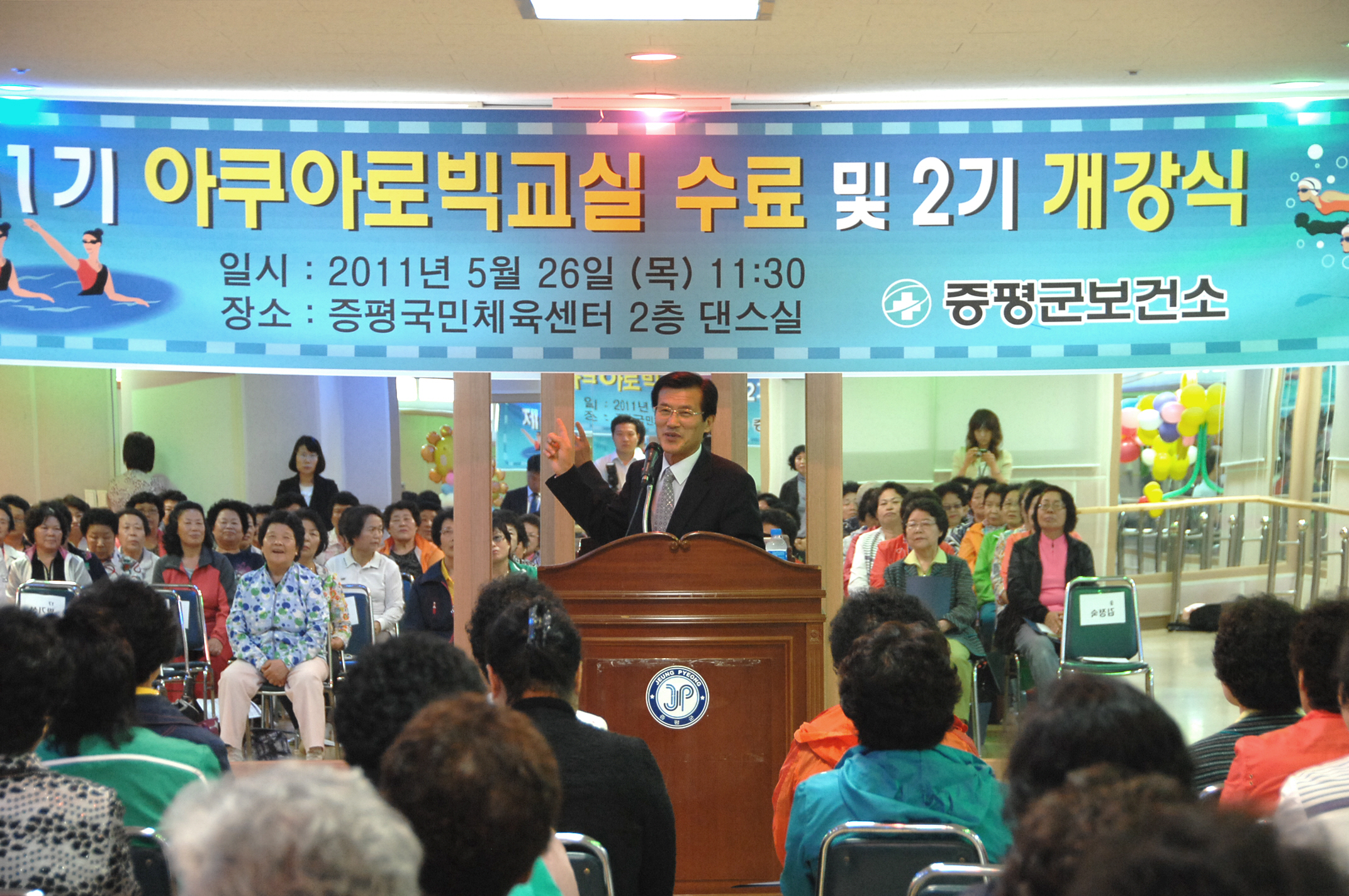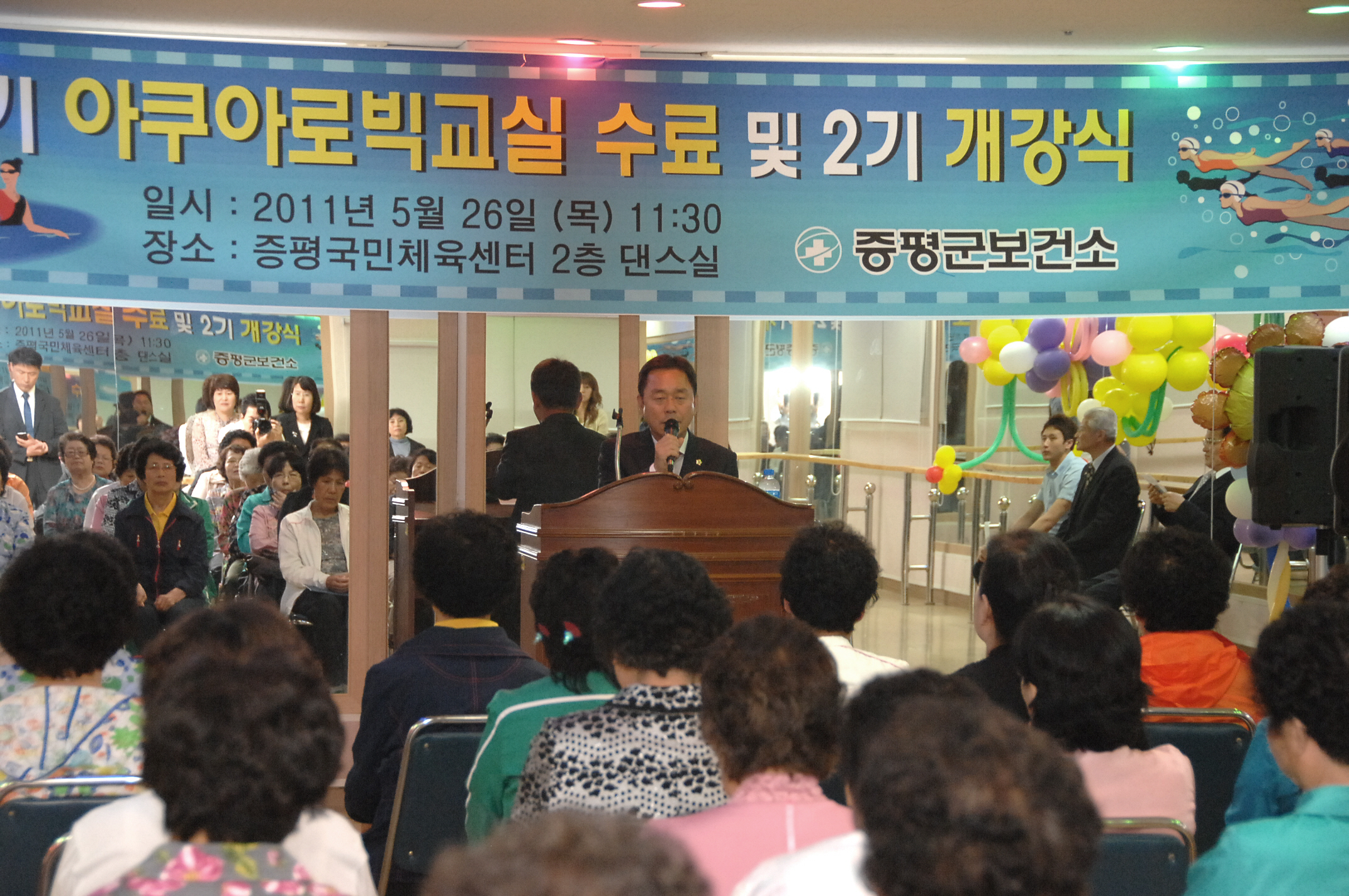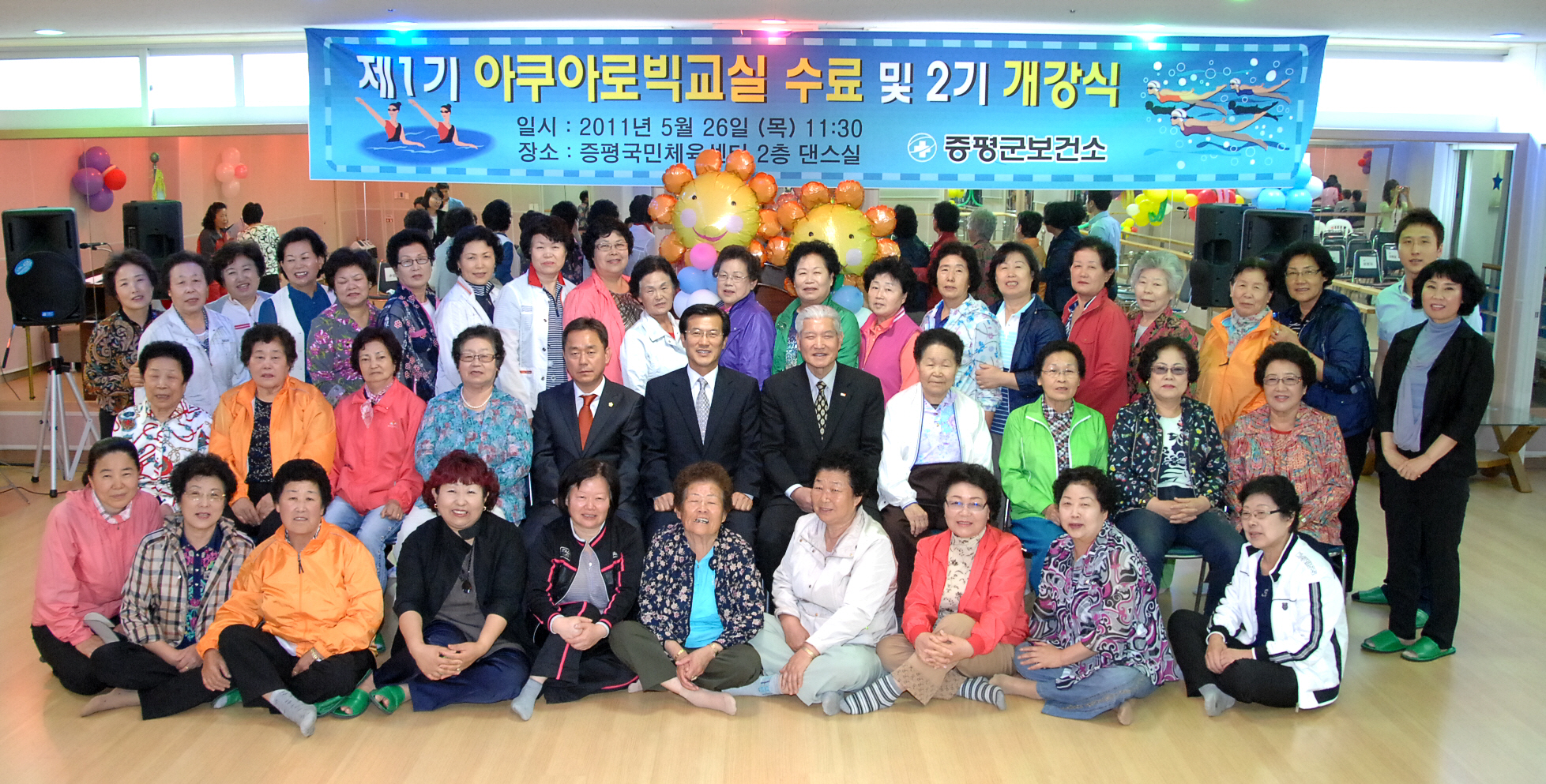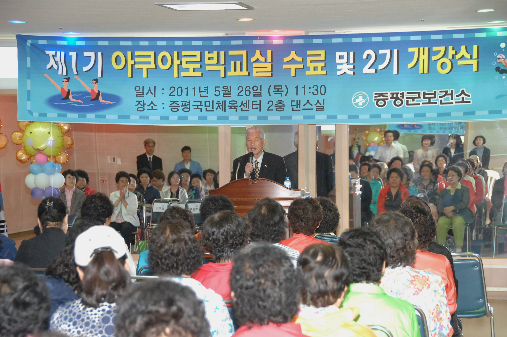 증평군보건소는 26일 오전11시30분 증평읍 송산리 증평국민체육센터에서 홍성열군수, 김재룡군의장, 조성훈충북사회복지개발회장, 박혜숙군보건소장을 비롯한 보건소 관계자와 수강생 등 90여명이 참석한 가운데 제1기 아쿠아로빅 수영교실 수료식 및 2기 개강식을 가졌다.[보도자료실 참조]