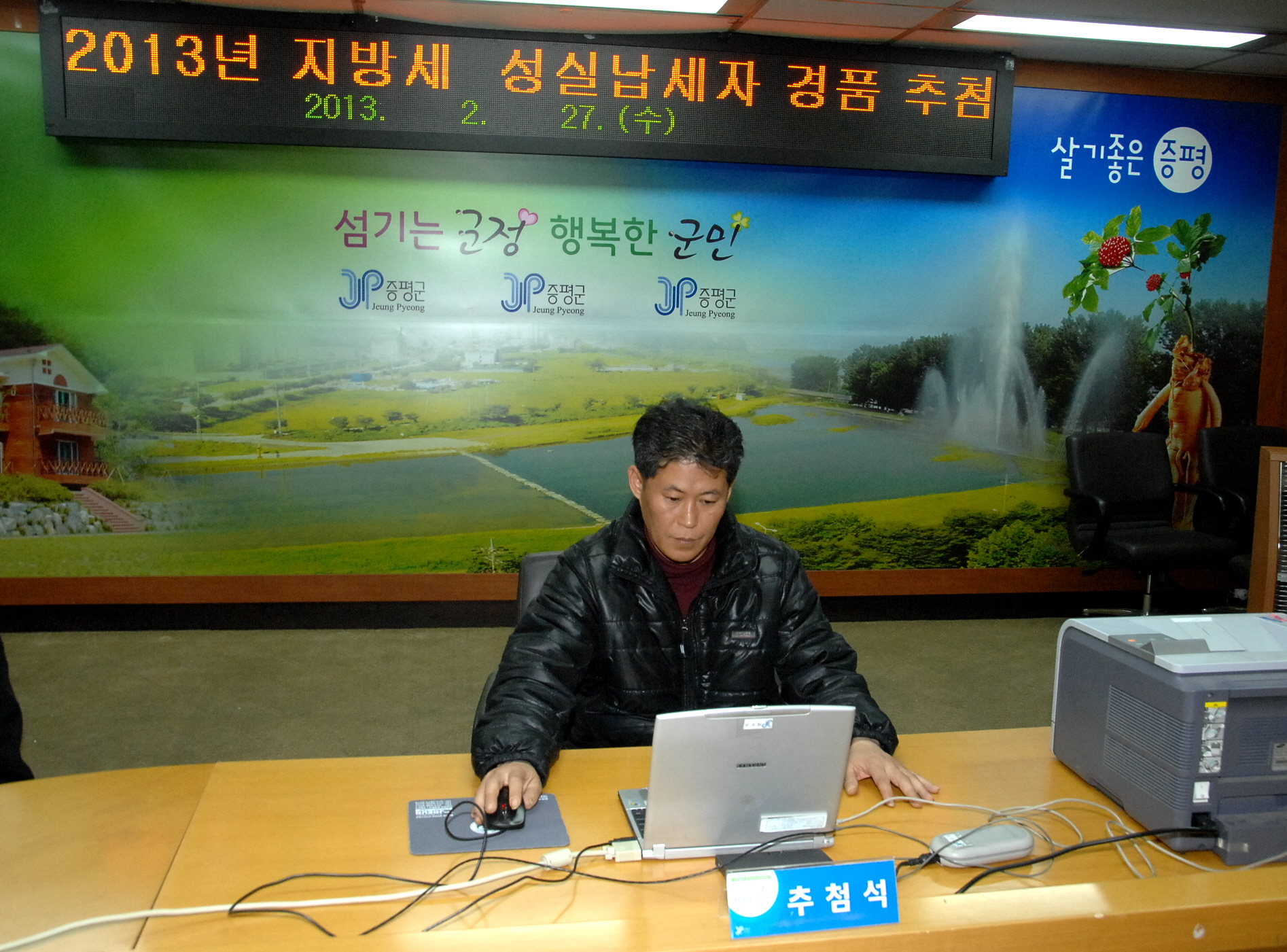 증평군은 27일 오후 3시에 군청 소회의실에서 홍성열 군수 및 관내주민 3명 등 20여명이 참석한 가운데 2012년 재산세(9월), 자동차세(12월)를 납기내 납부한 주민을 대상으로 경품 추첨 행사를 실시했다. [보도자료실 참조]
