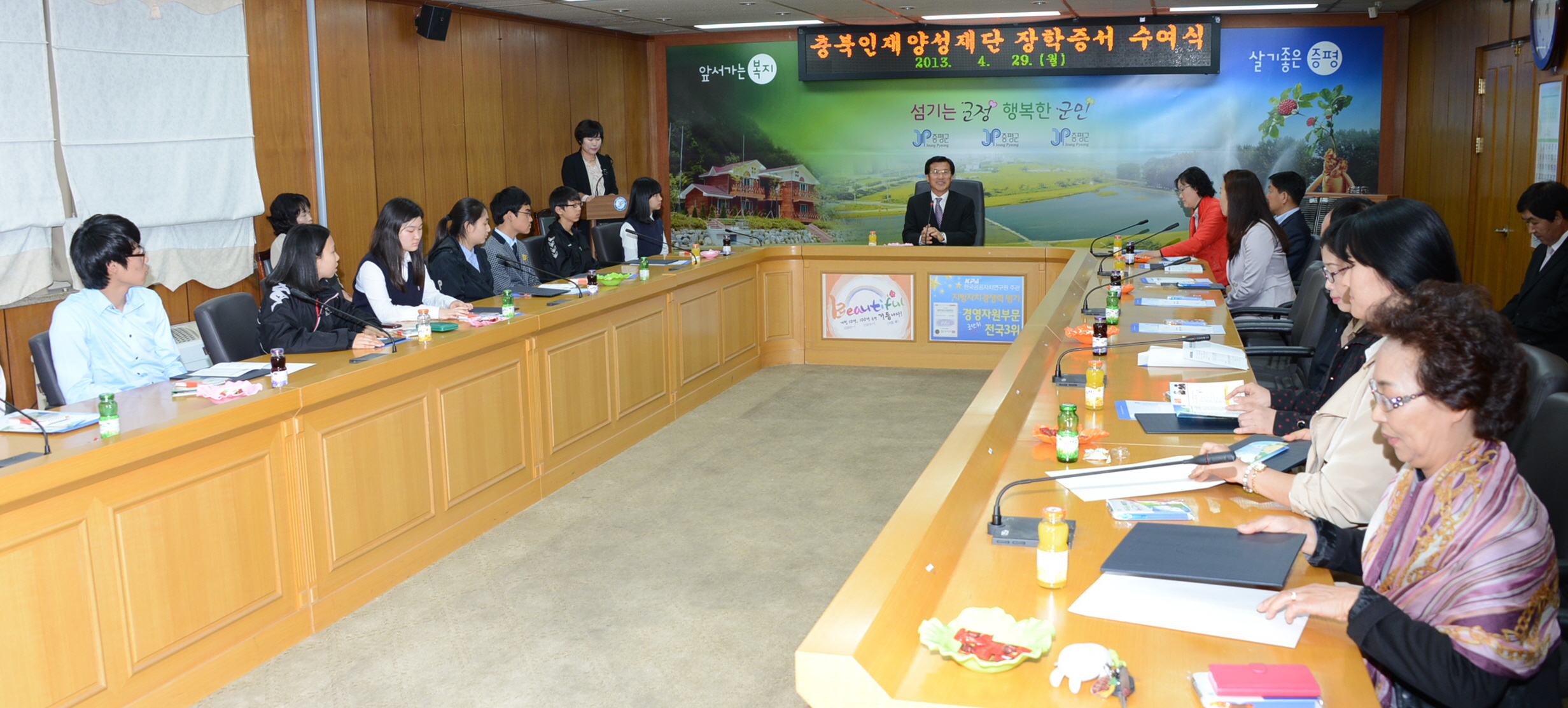 증평군은 29일 오후5시 군청 소회의실에서 홍성열 증평군수와 장학생, 가족 등 40여명이 참석한 가운데 2013년 상반기 충북인재양성재단 장학생 장학증서 수여식을 가졌다. [보도자료실 참조]