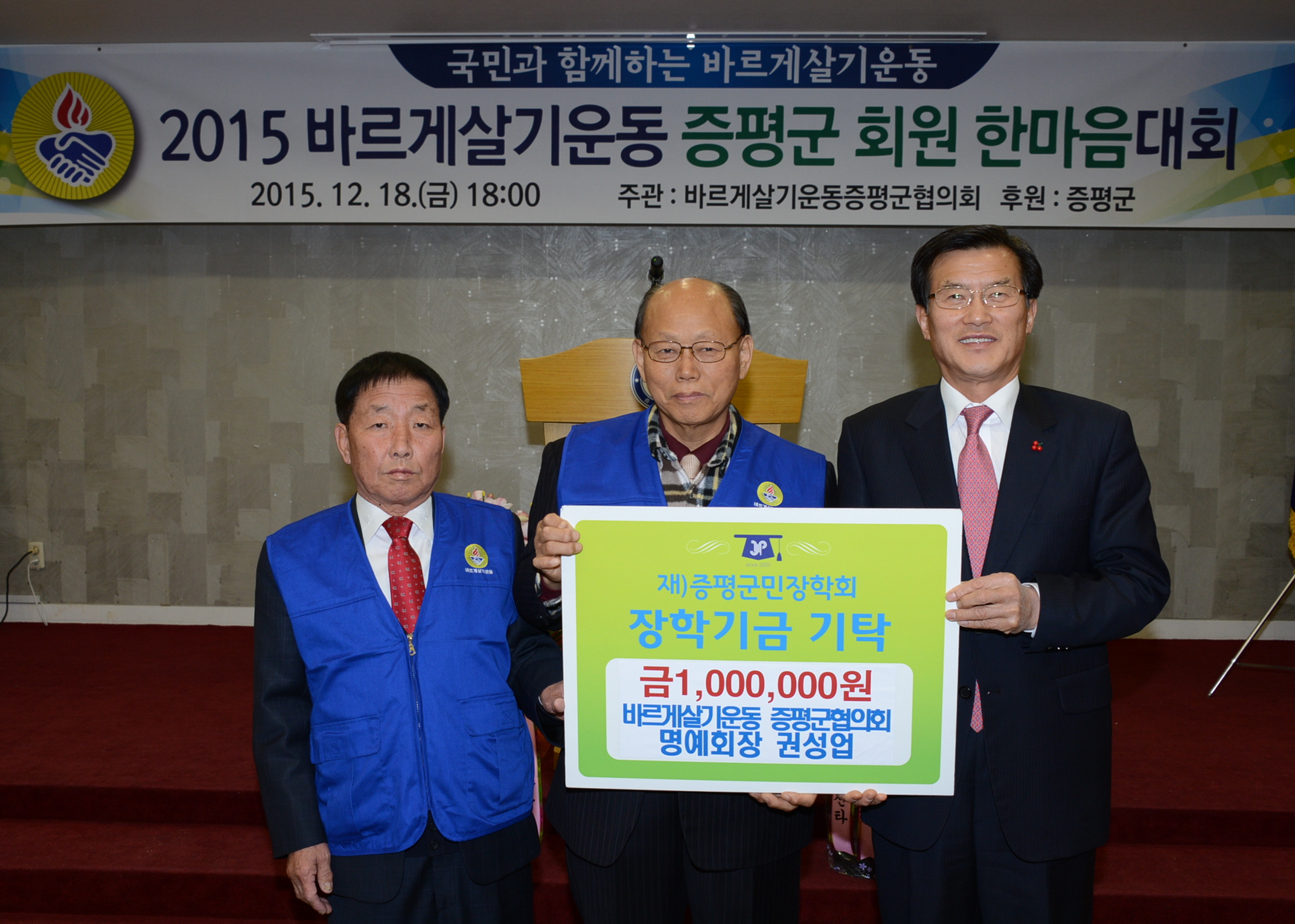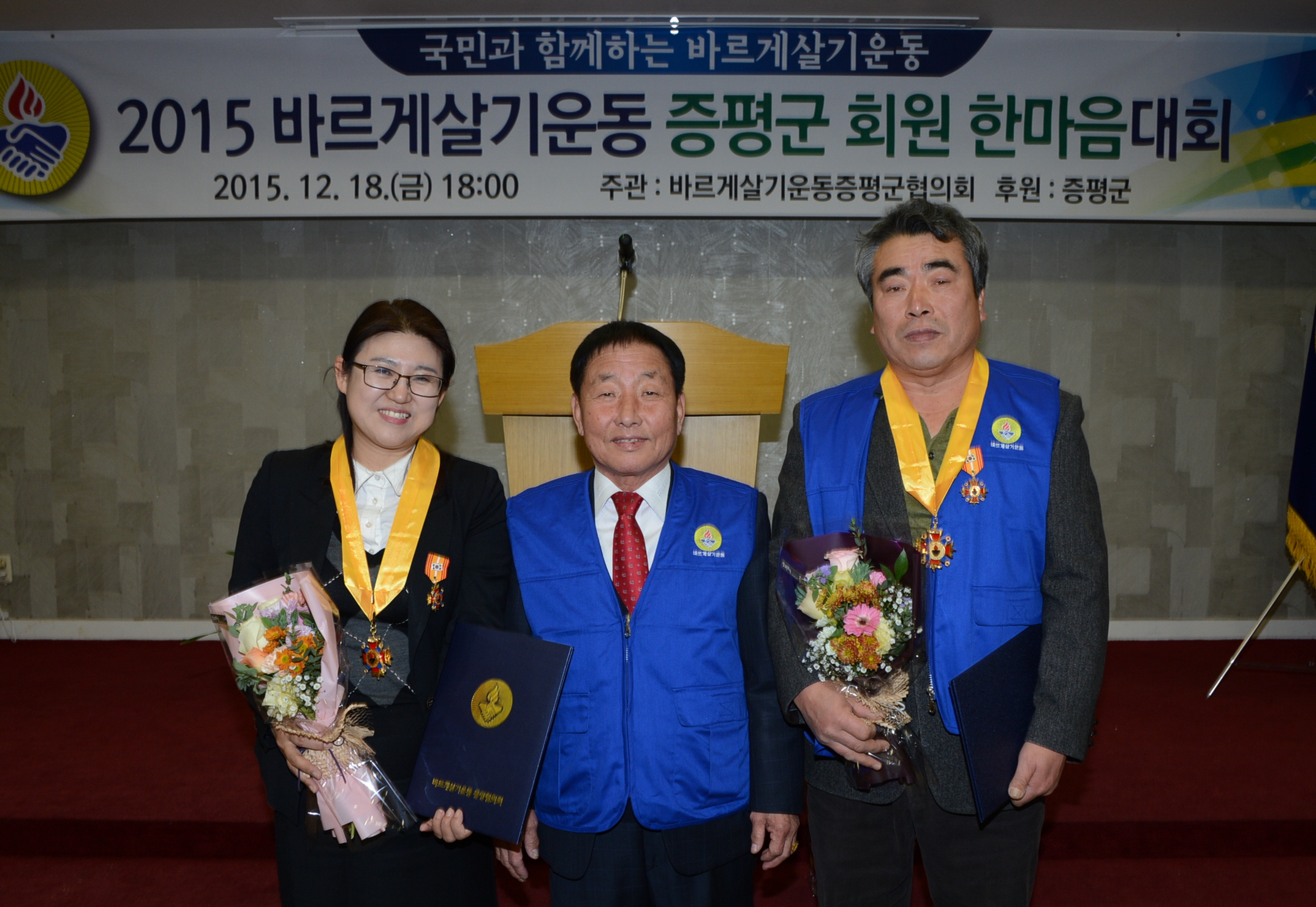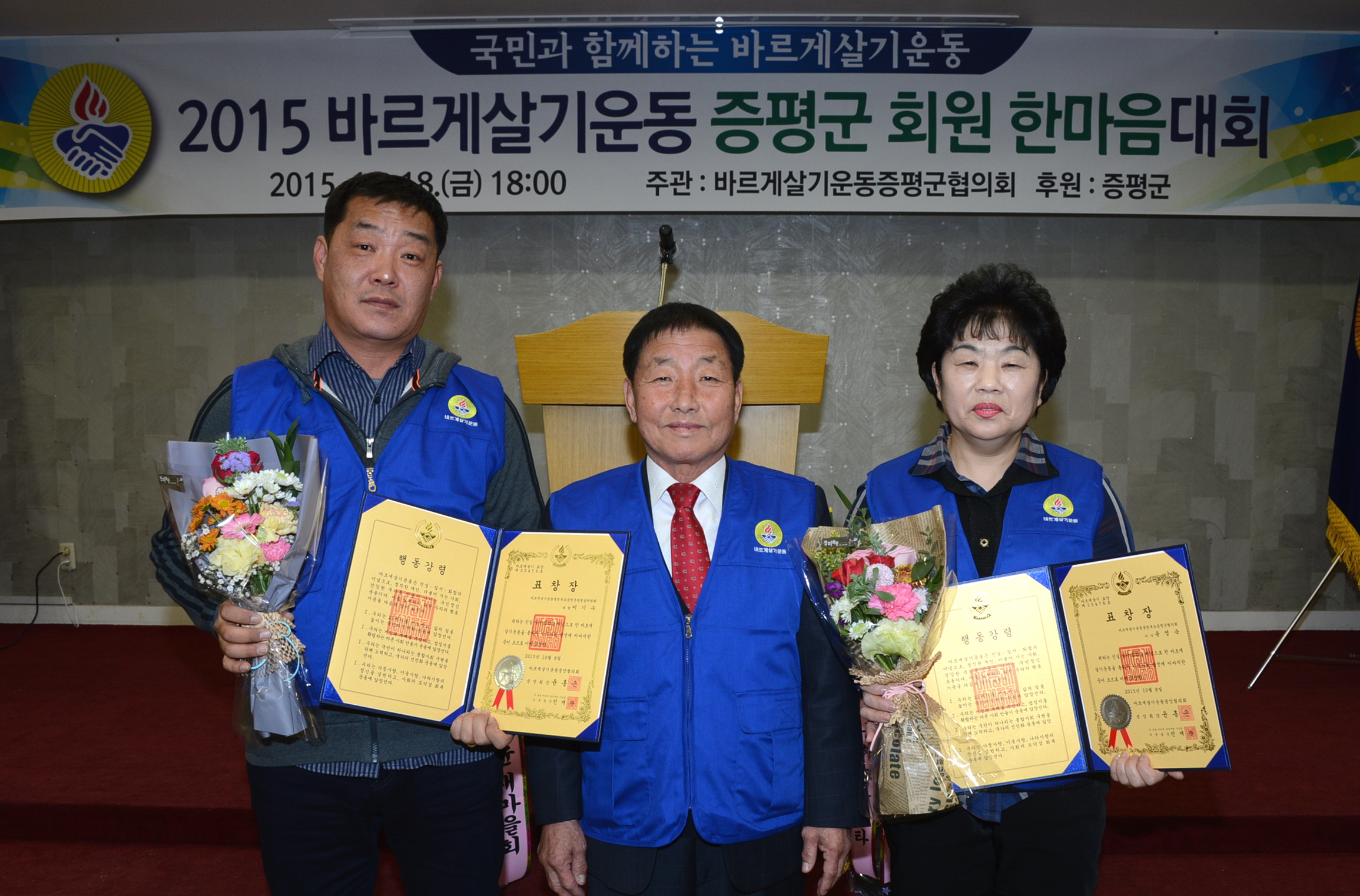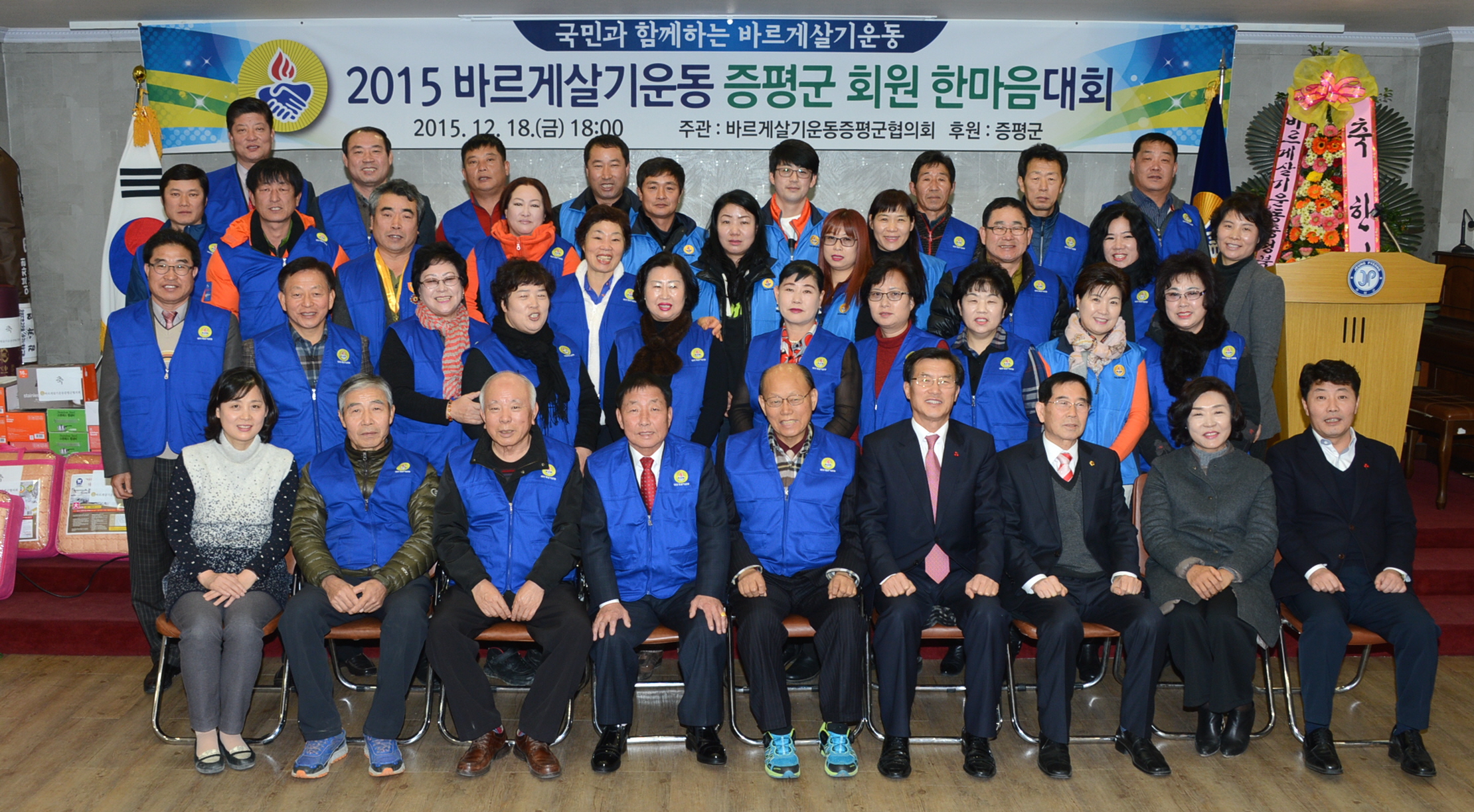 바르게살기운동증평군협의회(회장 연태희)는 18일 오후 6시 증평여성회관에서 홍성열 군수, 우종한 군 의장을 비롯해 협의회 회원 등 100여명이 참석한 가운데‘2015 바르게살기운동 한마음 갖기 회원대회’를 개최했다.(보도자료실 참조)