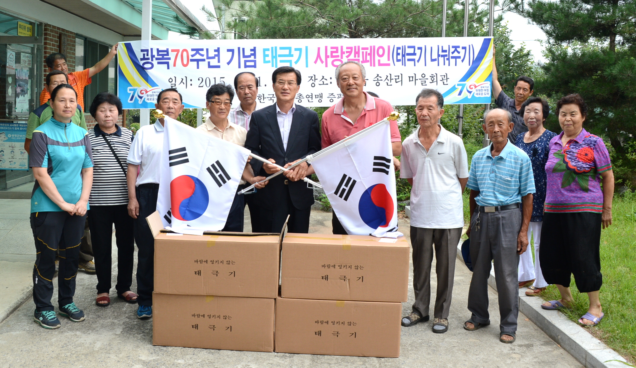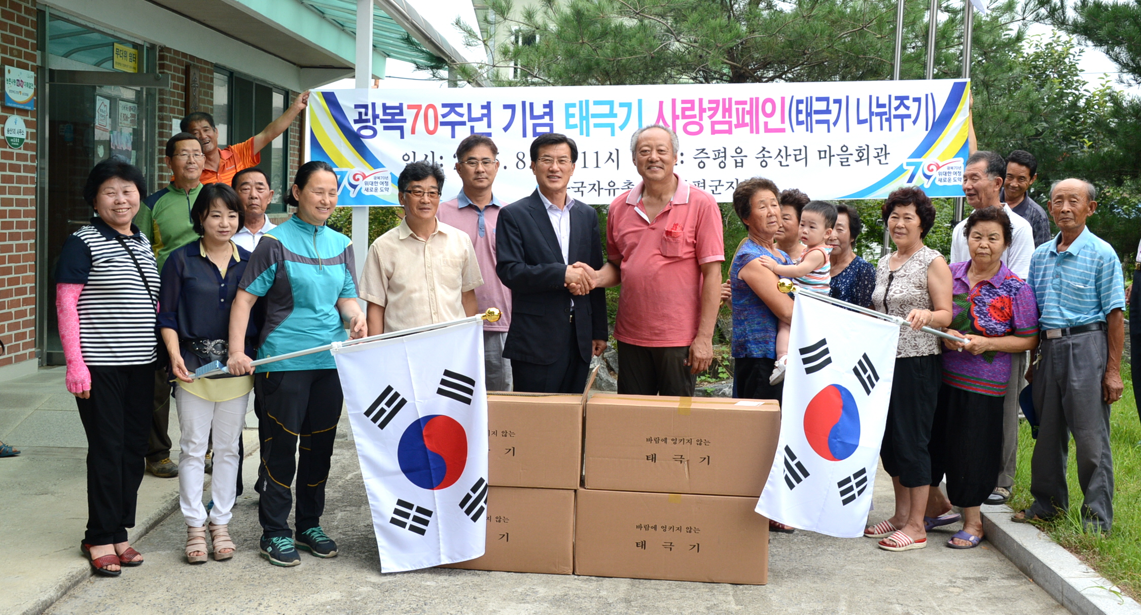 한국자유총연맹증평군지회(정태욱 회장)는 11일 오전 11시 정태욱 회장을 비롯해 회원 등 15명이 참석한 가운데 광복 70주년을 맞아 증평읍 송산1리(김용호 이장)와 도안면 화성3리(연풍희 이장)에 태극기 200여개를 나눠주는‘태극기 사랑 캠페인’을 실시했다.(보도자료실 참조)