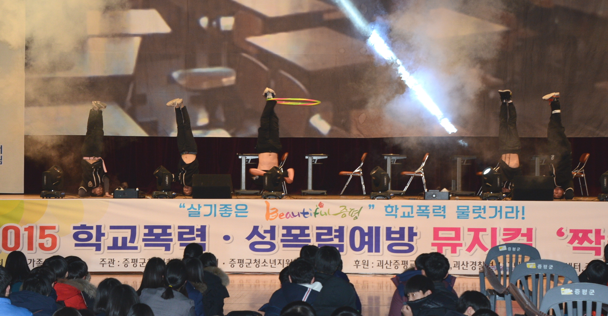 증평군청소년상담복지센터와 증평군청소년지원센터 꿈드림(센터장 김병노)은 17일 오후 2시부터 증평스포스센터에서 학교폭력(성폭력) 예방에 대한 뮤지컬 공연(힐링 뮤지컬 짝꿍) 및 체험부스를 운영했다. (보도자료실 참조)
