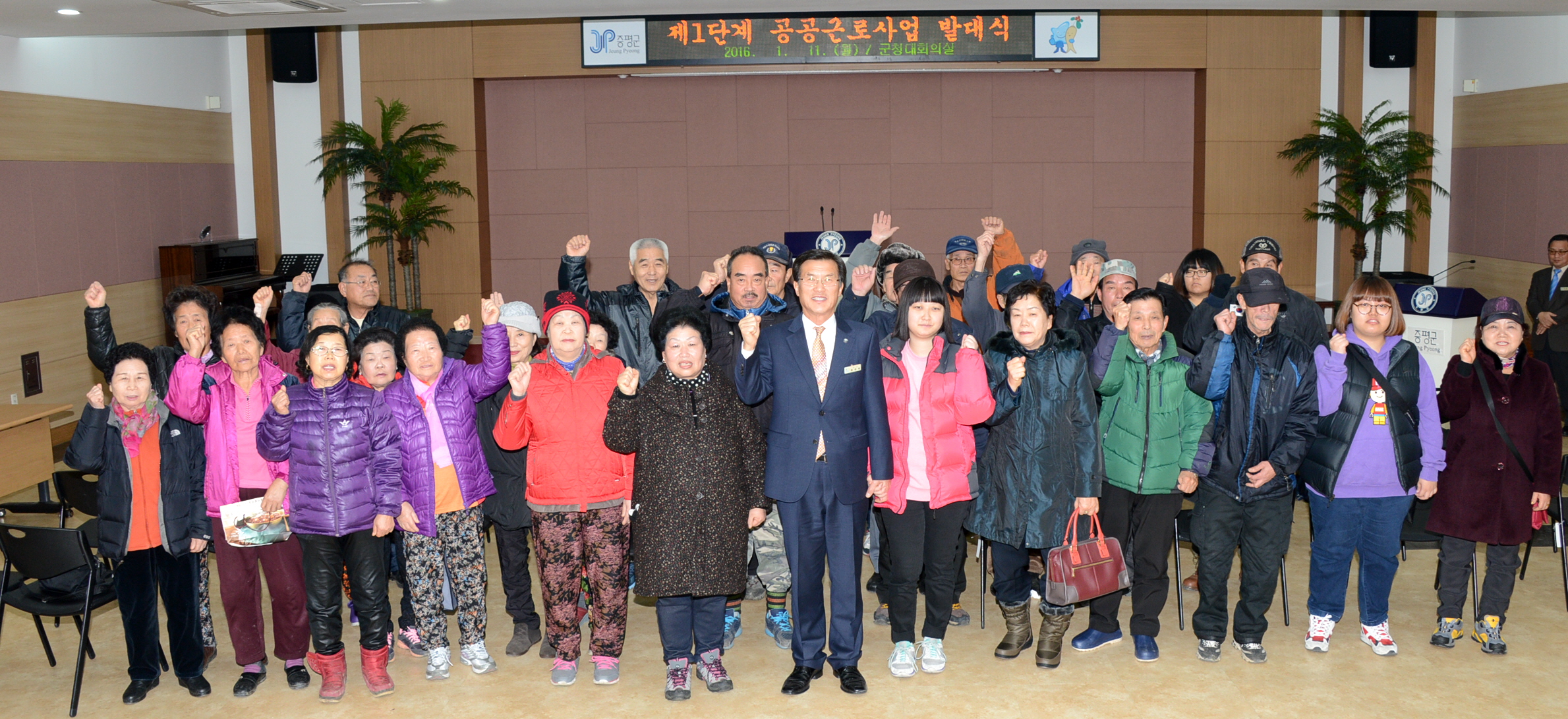 증평군은 11일 오전 11시 군청 대회의실에서 홍성열 증평군수, 공공일자리사업 참여자 및 관계공무원 등 50여명이 참석한 가운데‘2016년 제1단계 공공근로사업’발대식을 가졌다.(보도자료실 참조)