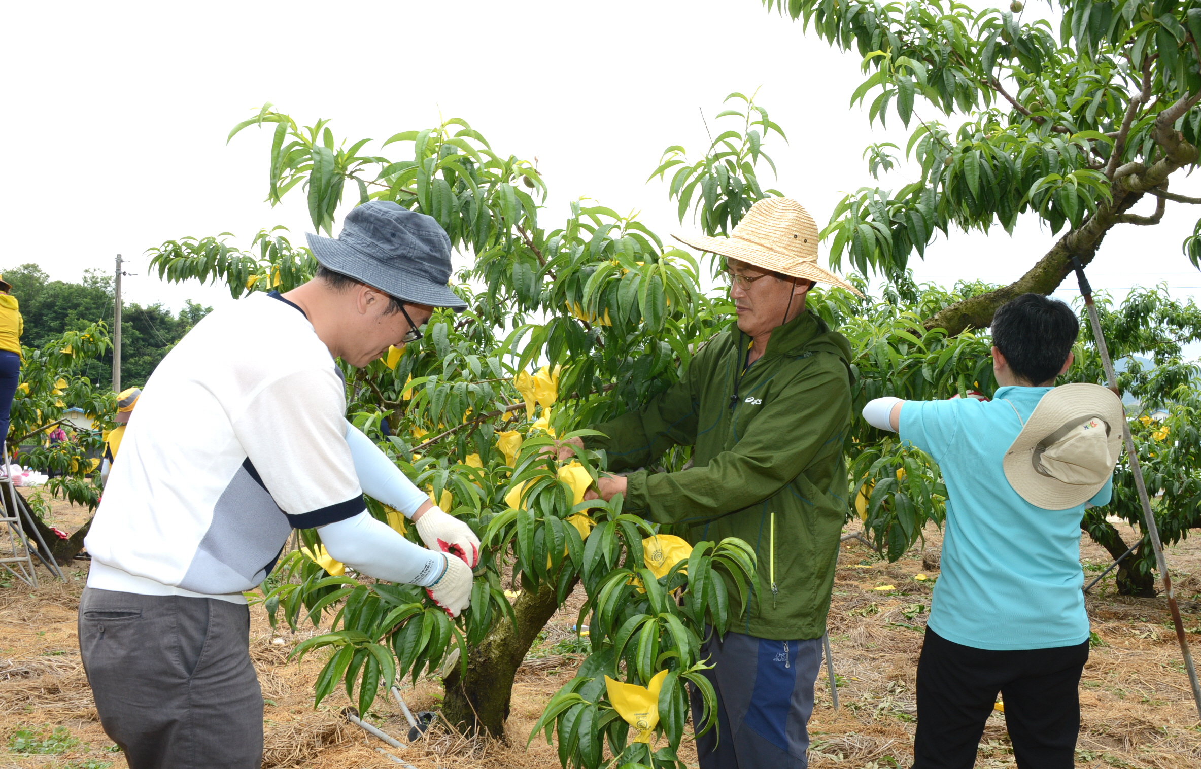 증평군은 5일 도안면 송정리 박철규씨 복숭아 밭에서 홍성열 군수를 비롯한 공무원 50여명이 참여한 가운데 농촌인구 감소 및 고령화 등으로 노동력 확보에 어려움을 겪는 농가의 적기 안정 영농 추진을 위해 ‘농촌일손돕기’를 실시했다.[보도 자료실 참조]