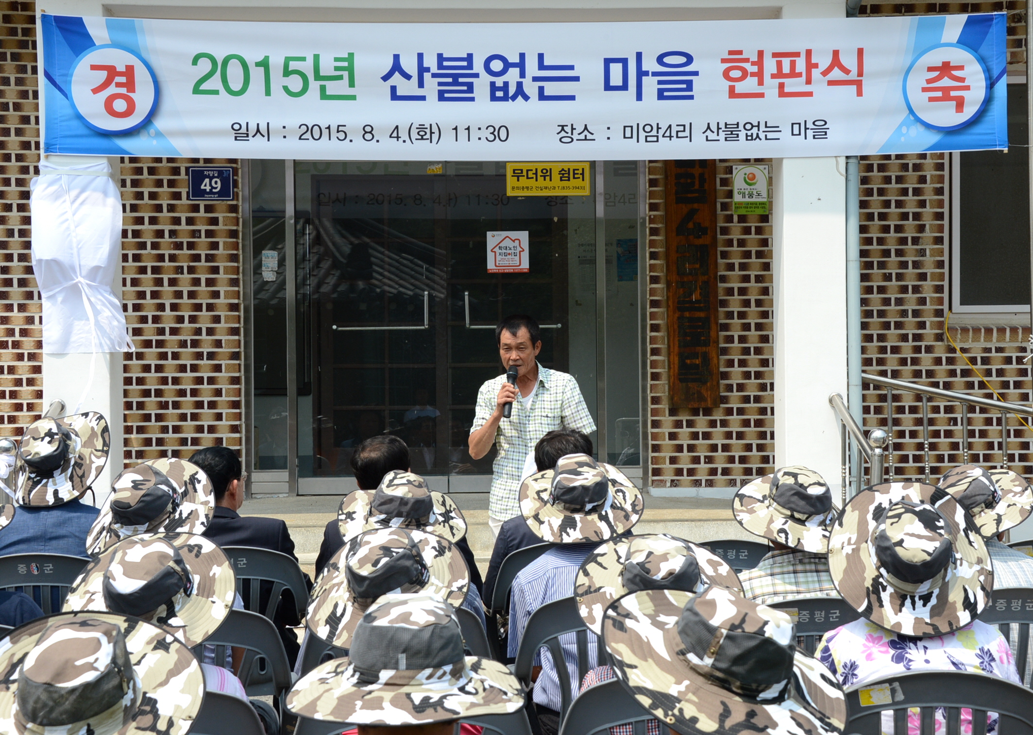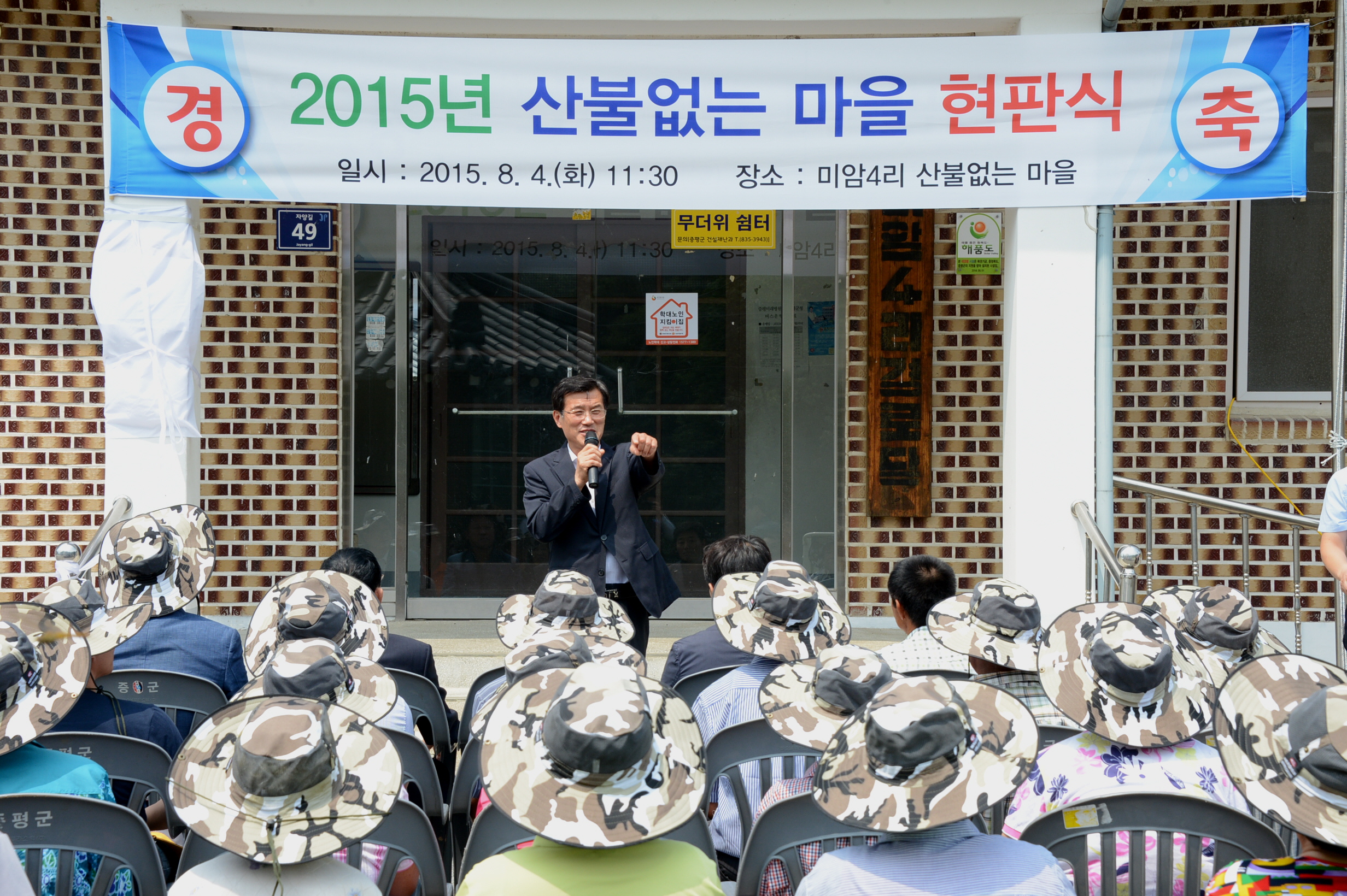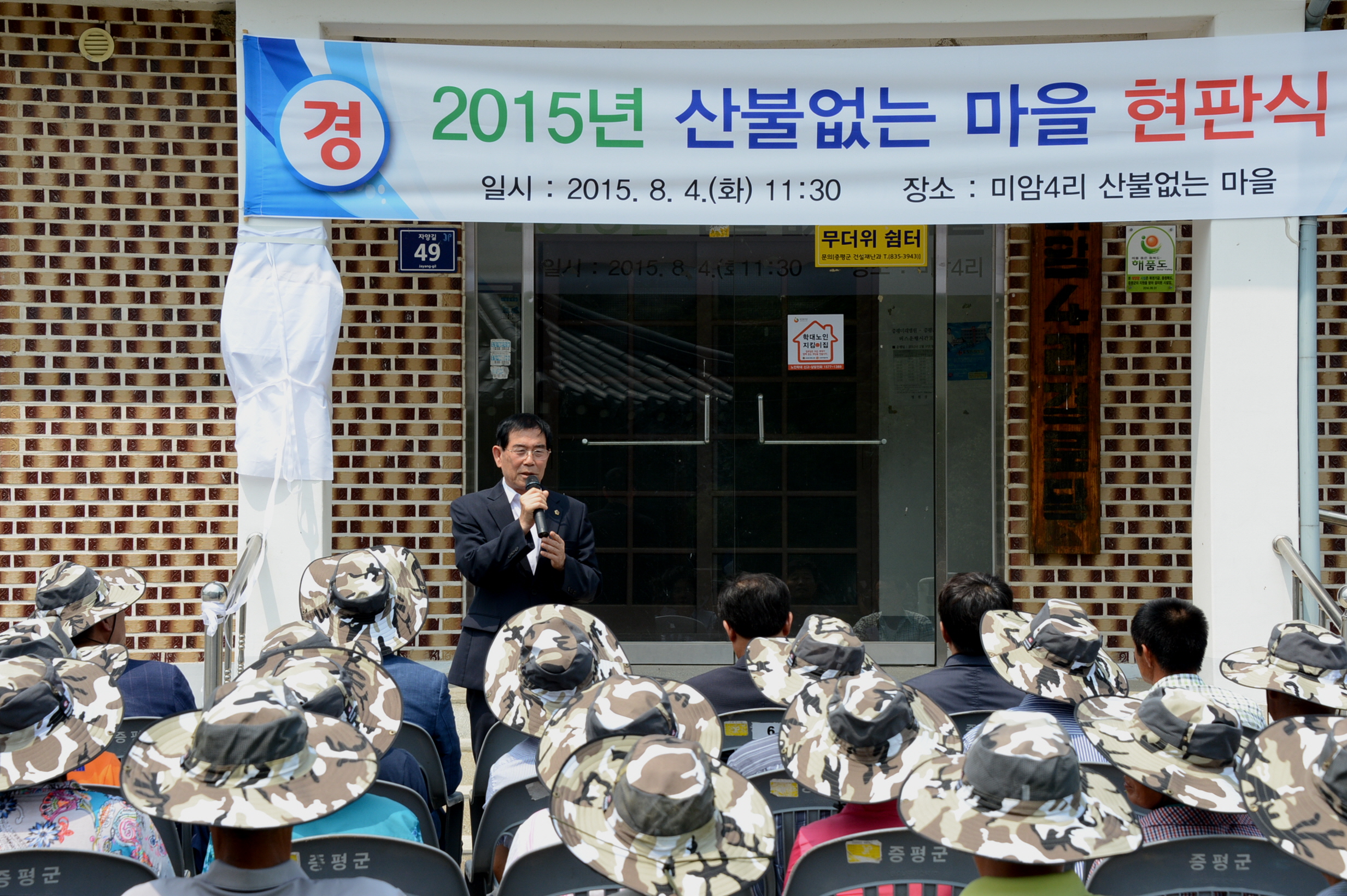 증평군은 4일 오전 11시 30분 증평읍 미암4리 마을회관에서 홍성열 군수, 우종한 군의장. 김봉회 도의원을 비롯해 지역 주민 등 40여명이 참석한 가운데‘산불 없는 마을" 현판식을 가졌다.(보도자료실 참조)