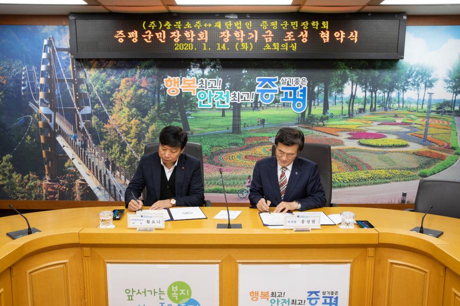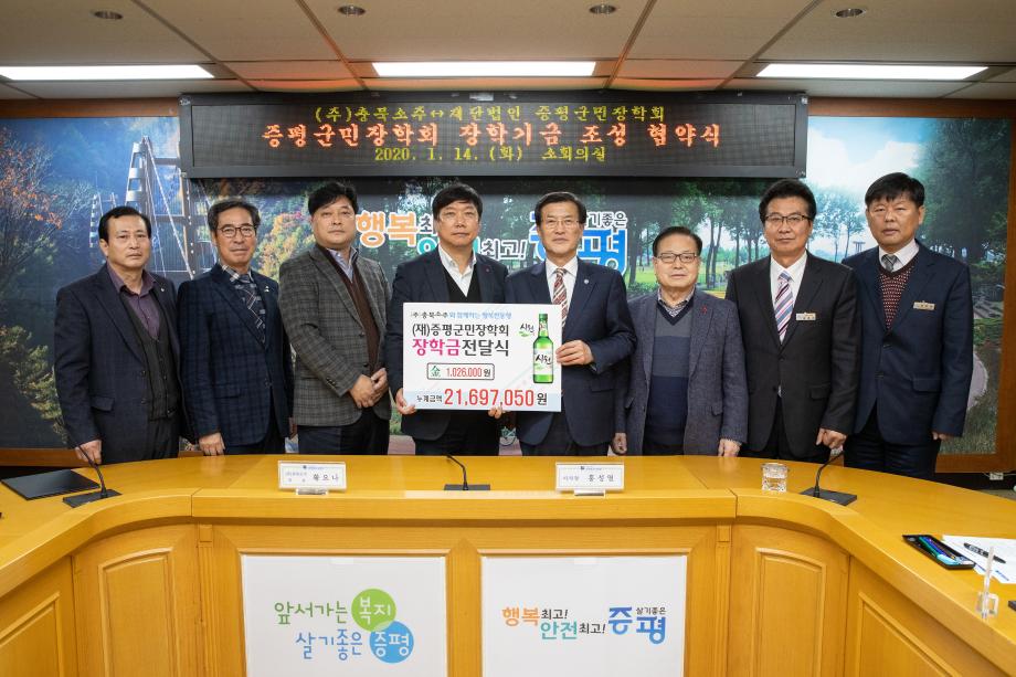 ㈜충북소주, 증평군민장학회 장학기금 기탁…올해도 영업용 소주 1병당 5원 씩 기탁 약속