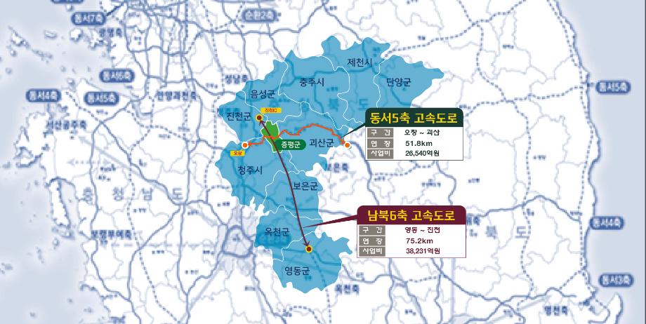 충북 증평군을 통과하는 2개(동서5축, 남북6축)의 고속도로 신설계획이 국토교통부의 2차 고속도로 건설계획(2021~2025)에 반영됐다.