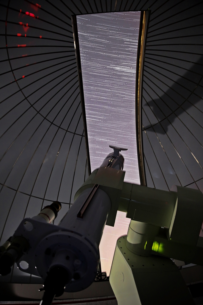 겨울밤하늘의 많은 별들과 천체를 보는 커다란 눈 356mm 굴절망원경입니다.