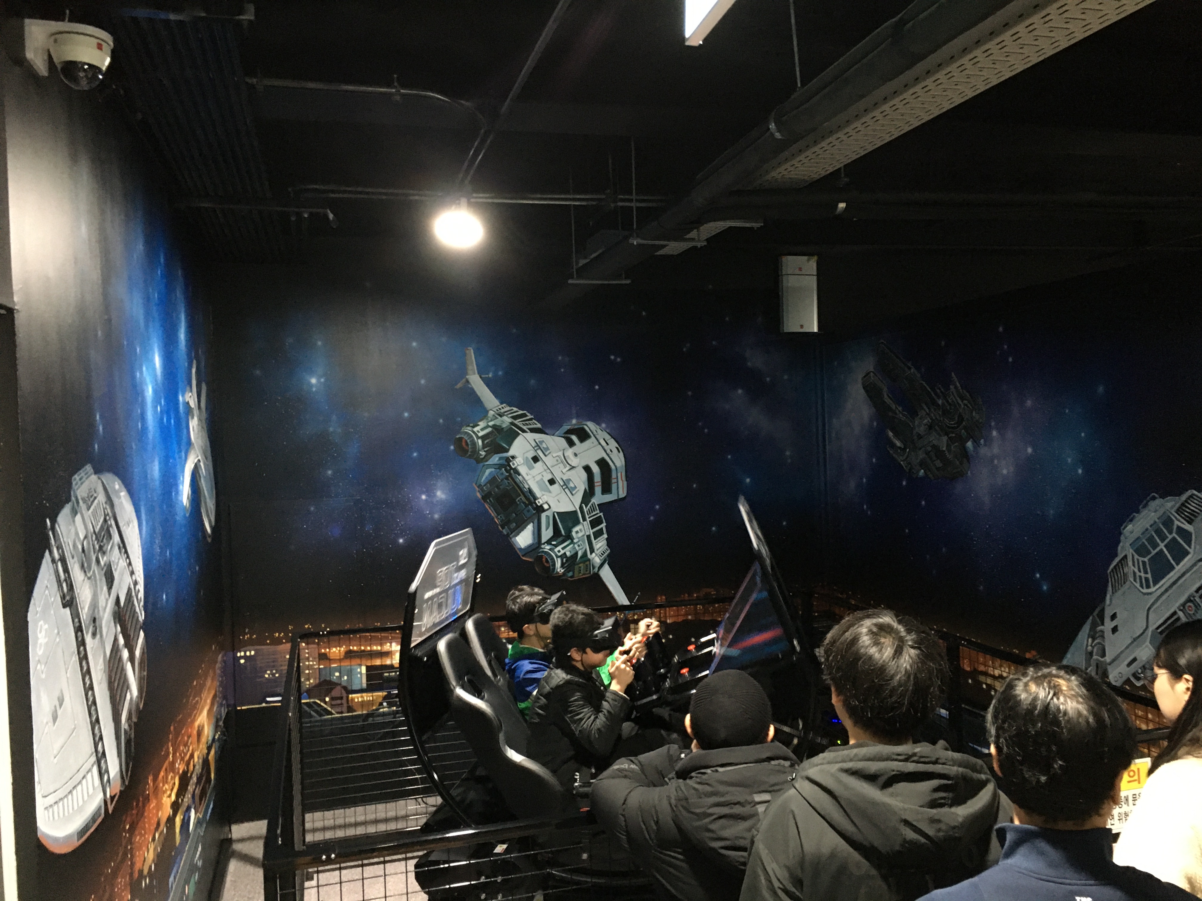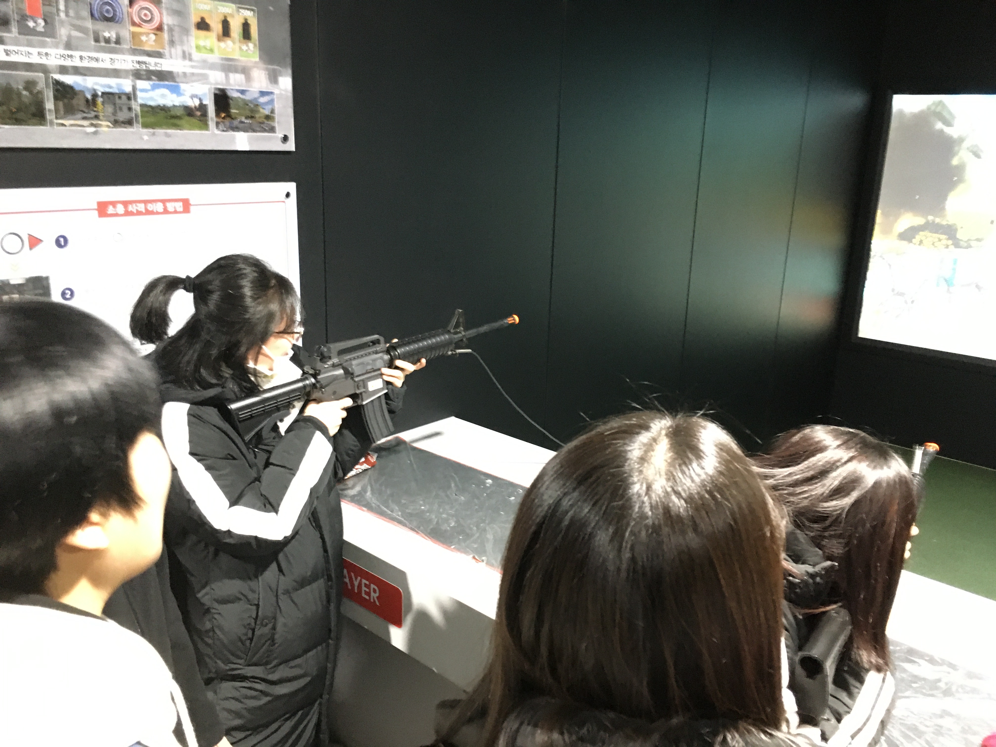 가상현실체험장에서 사격실력을 뽐내는 학생의 모습이 멋지네요~