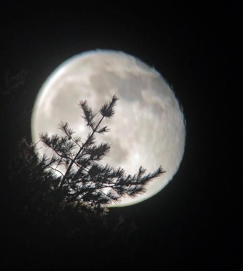 음력 17일 달이 떠오르며 소나무와 멋진 그림을 만들었습니다.