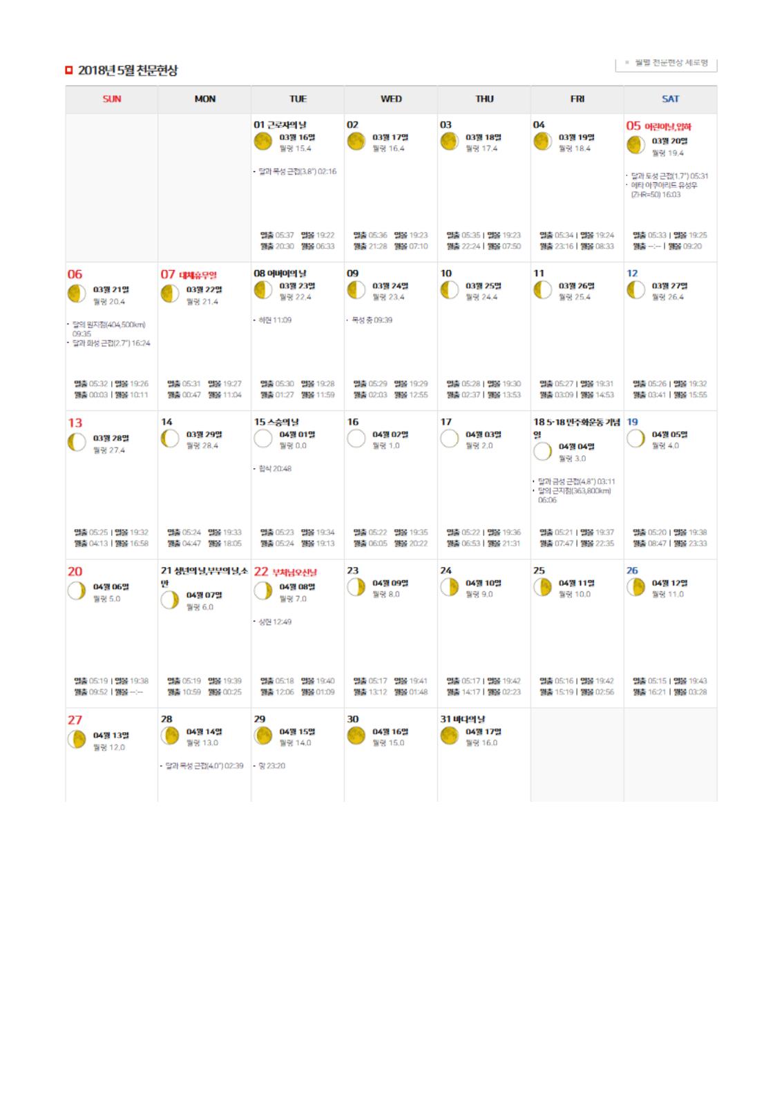 2018년 5월 별자리와 천문현상입니다.