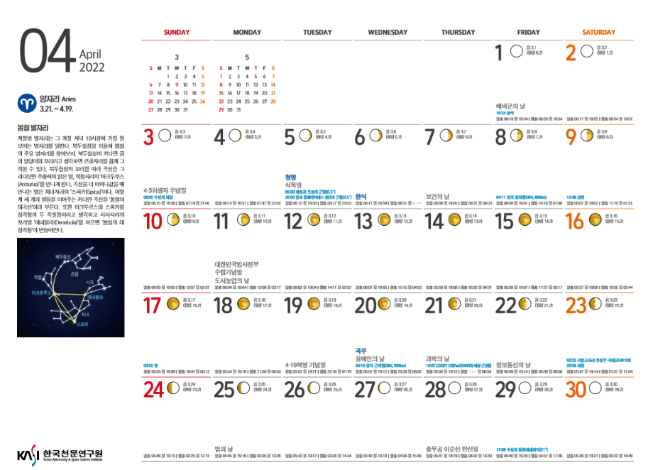 2022년 4월 천체관측대상과 천체현상입니다.