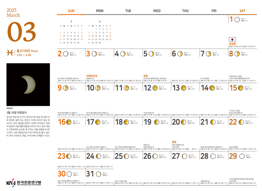 2025년 3월 천체관측대상과 천체현상입니다(3월15일 20시 기준)