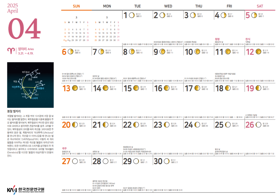 2025년 4월 천체관측대상과 천체현상입니다(4월15일 21시 기준)