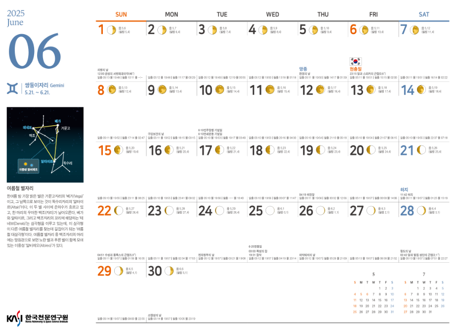 2025년 6월 천체관측대상과 천체현상입니다(6월15일 21시 기준)